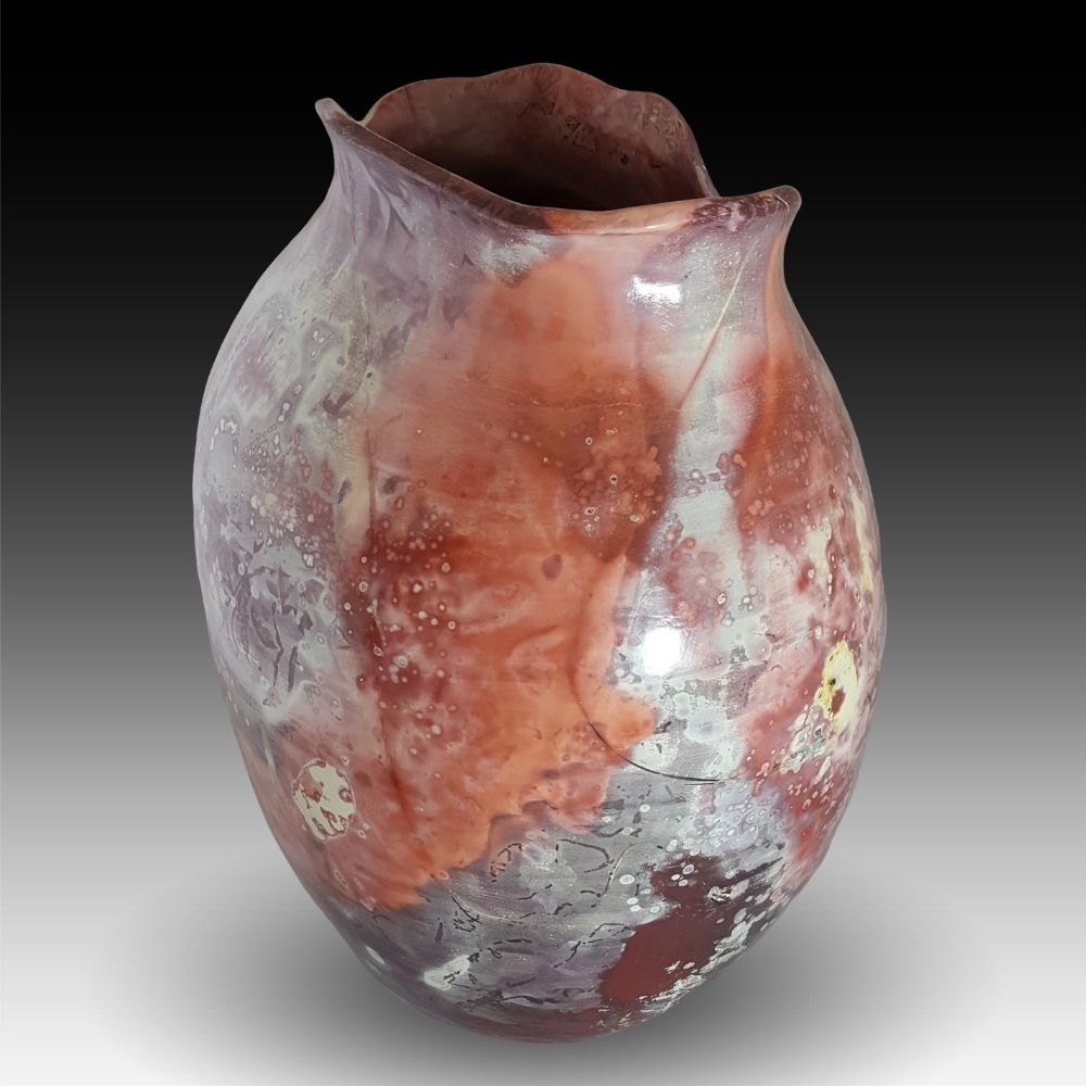 In addition to the white cherry blossoms, “Cherry Blossoms” has leaf and pine cone patterns randomly appearing. None of this is pre-planned. It’s the result of the crushed foil saggar wrapping the piece, which has been dunked in ferric chloride, sprinkled with a bit of sugar and occasional strands of copper wire draped around the lip and shoulder. Plus a little handful of sawdust placed in the bottom of the piece, or around the foot on the outside.
