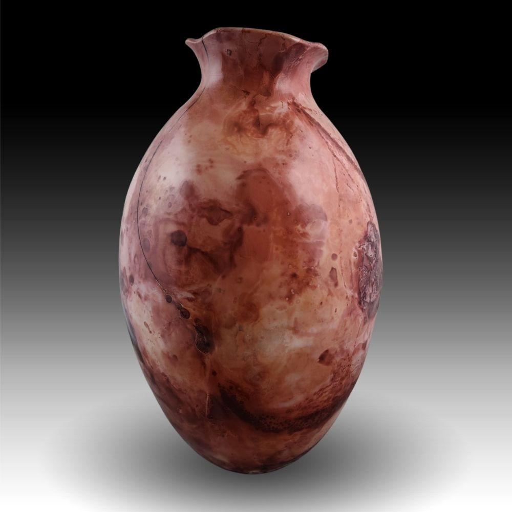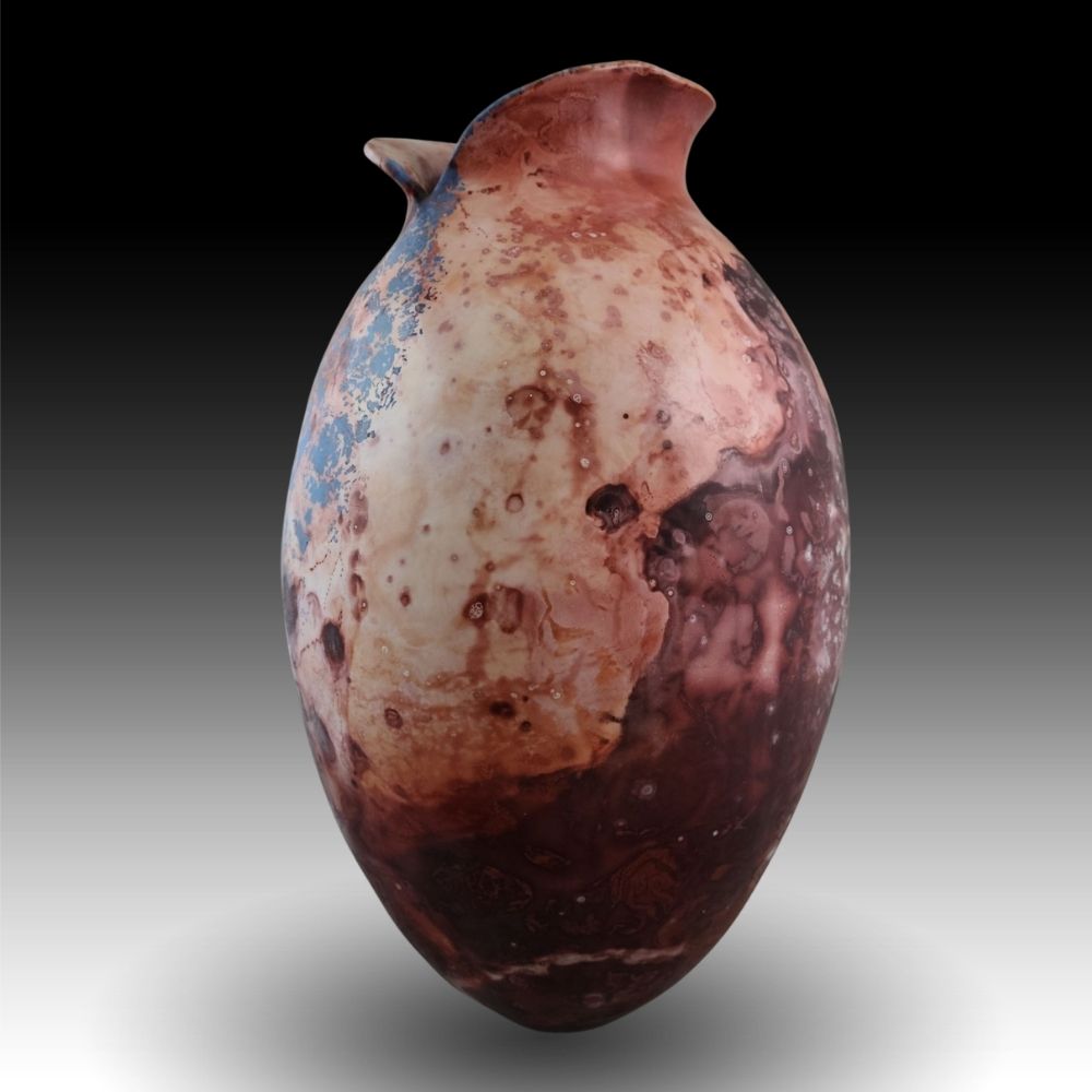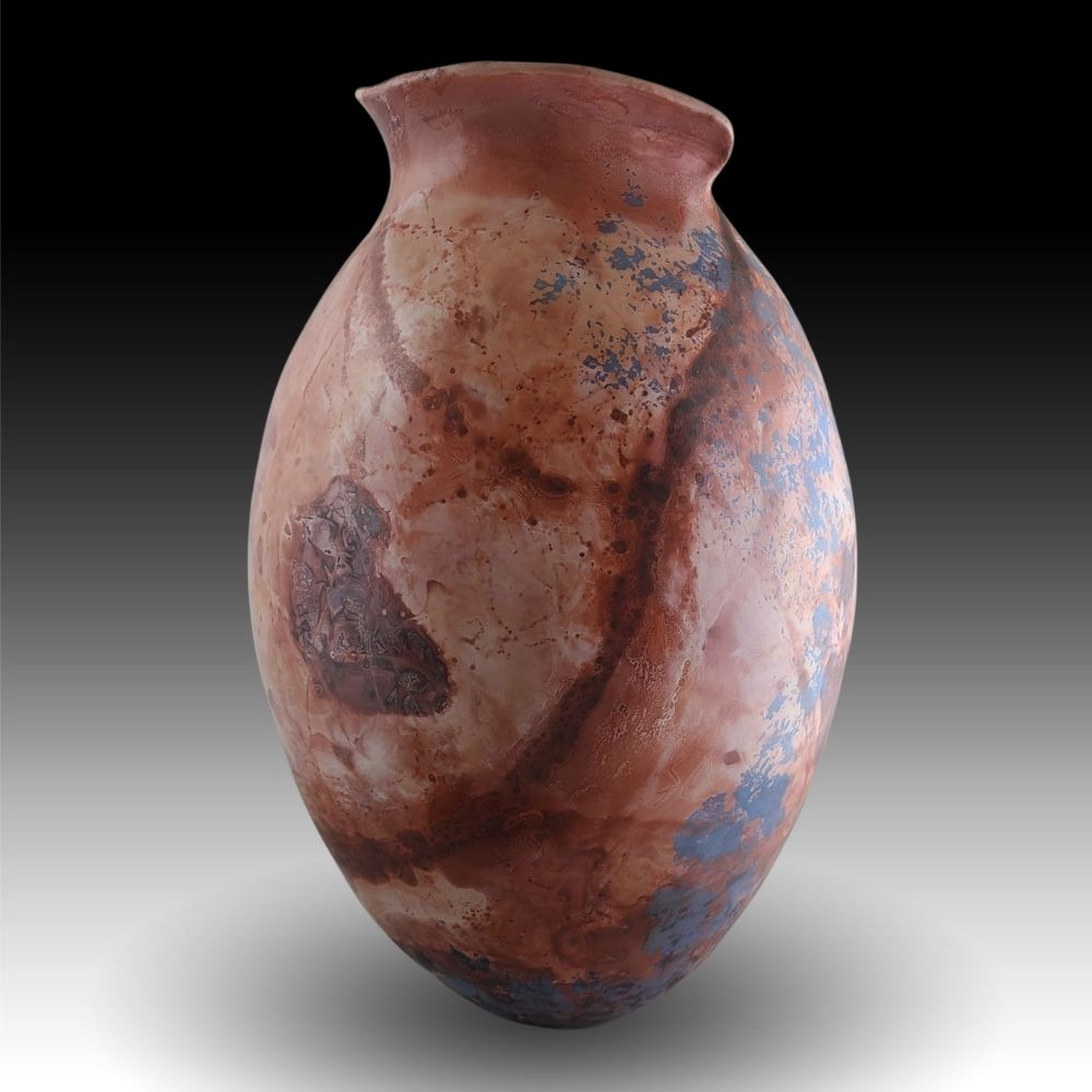 Grizzly Creek Fire and Floods is hand-built with my favorite Laramie Formation pure white native clay, which I dig and refine myself. My favorite firing method, fumed saggar firing, actually requires 2 firings – one to 1830ᵒF to harden the clay, with nothing more than a super-refined white slip air brushed on the bone-dry piece, and perhaps a little additional color, in this case some more of that white slip tinted with cobalt sulfate, blotted onto the surface. The second, more dramatic firing creates the rest of the color. Tightly wrapped in crumpled aluminum foil, the piece fumes after being immersed in ferric chloride (a liquid iron source) and is sealed up to smoke with various other combustible elements until it reaches 1300ᵒF when I shut down the fire. After it is cooled and cleaned, each piece is buffed vigorously with several coats of a very hard wax to seal and protect to color.