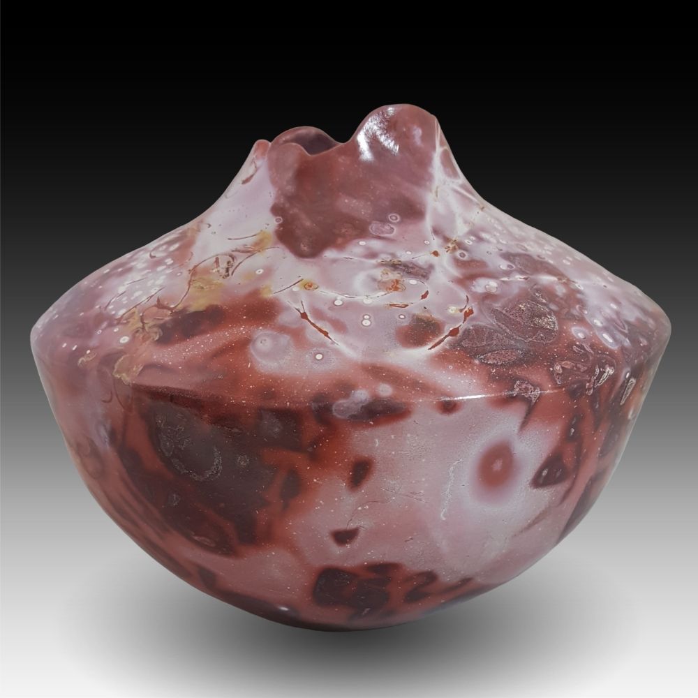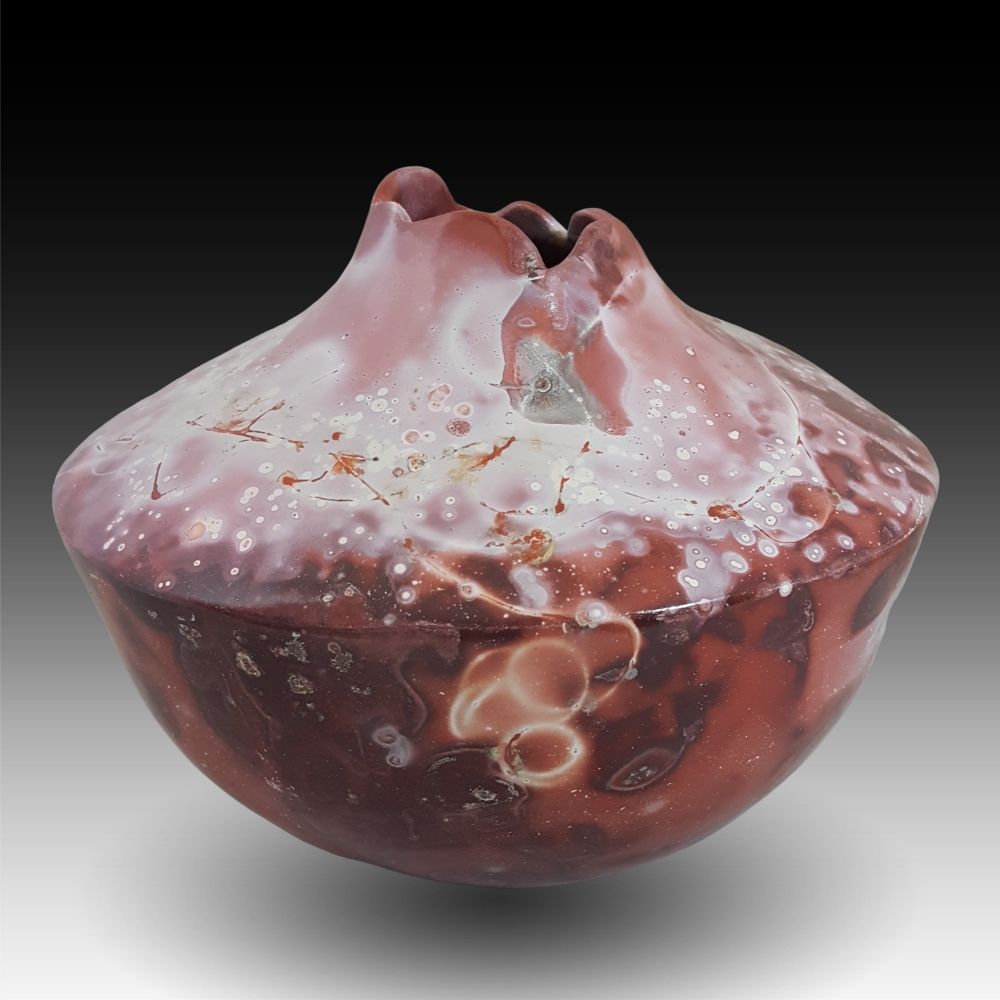 Peppermint Snowstorm Saggar-Fired, Sold Description Peppermint Snowstorm was whimsically named as I polished it on Christmas Eve, as an unforecast but vigorous snow swept over my studio. It is a fumed, saggar-fired piece. Dimensions 7.5″w x 7″h Price $225 Location SOLD