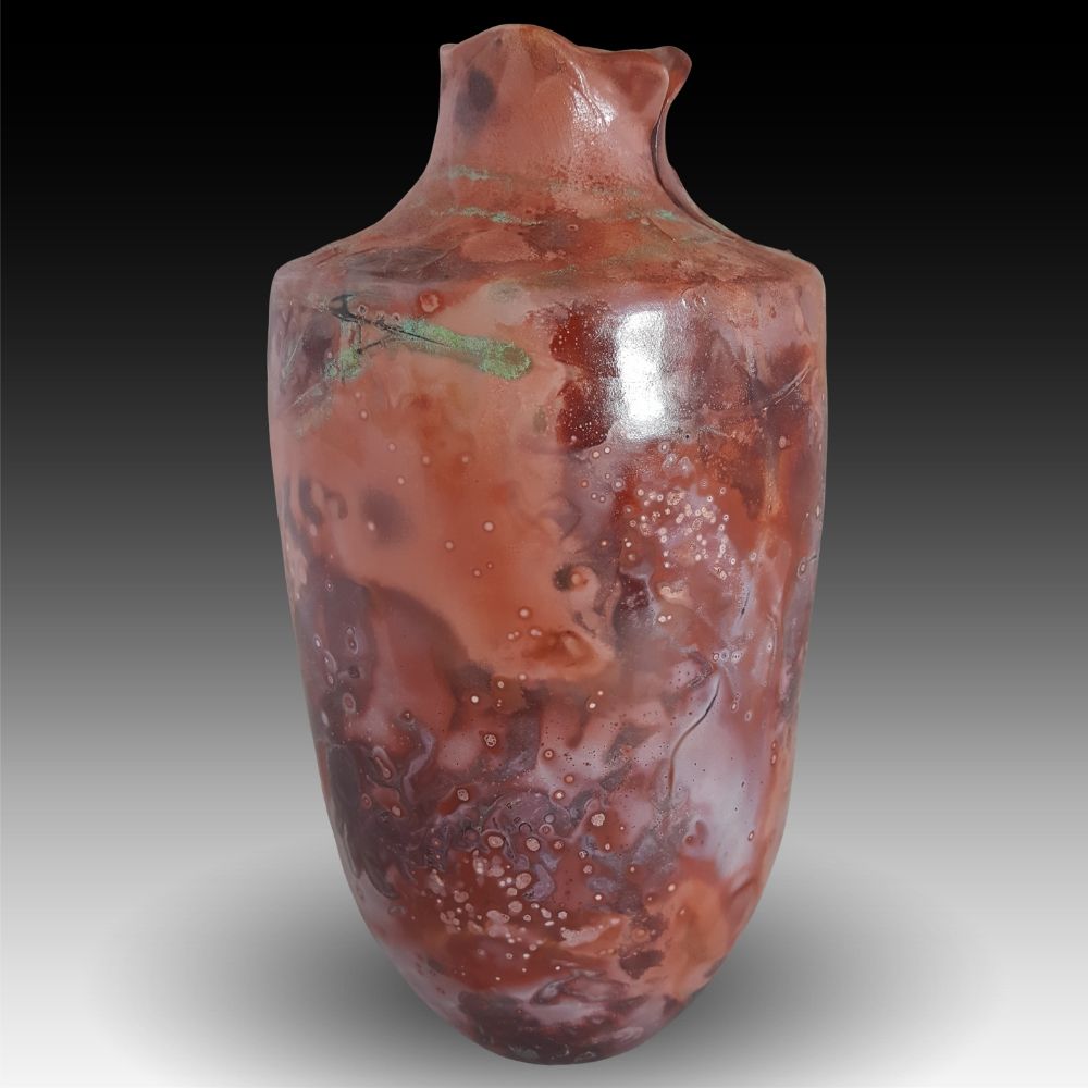 The Salmon Galaxy Bristlecone Pottery, Saggar-Fired Description “The Salmon Galaxy” is named for a small galaxy of that same name, recently discovered. Dimensions 6″w x 11″h Price $180 Location Bristlecone Pottery